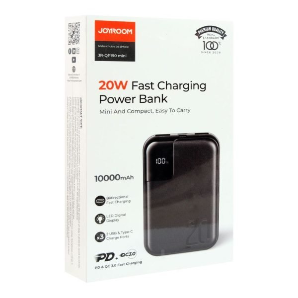 The Joyroom QP190 mini 10000mAh 20W Fast Charging Power Bank is a compact and portable power bank that offers fast charging capabilities. It features a built-in 10000mAh battery that can charge most smartphones up to 2.5 times, and it also supports fast charging up to 20W.