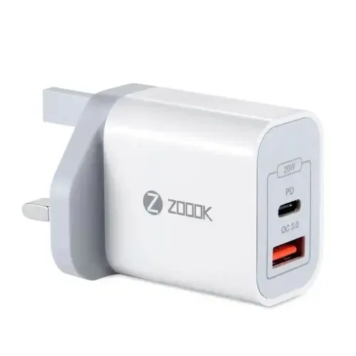 The ZOOOK Bolt Charge Duo 20 Fast Charger comes with Qualcomm 3.0 Quick Charge, providing 20 watts of output. It has two USB ports for fast charging. The ZOOOK Bolt Charge Duo 20 includes one Type C USB power delivery port and one USB A charging port. It offers rapid 20W fast charging. The input power is AC 100-240V, and the output is 20W PD: DC 5V3A/9V 2.2A/12V 1.65A. The charger works with iPods, iPhones, and iPads.